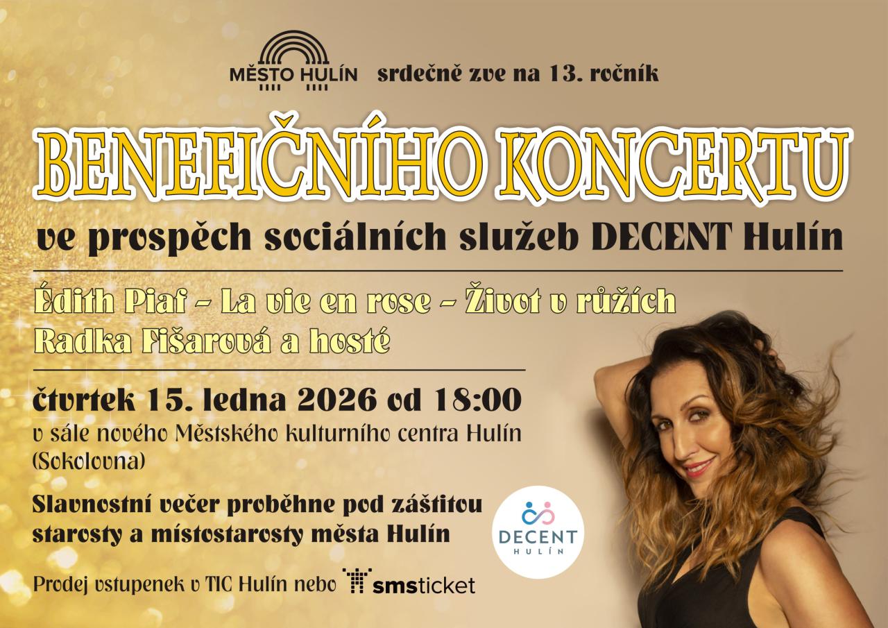 Město Hulín Vás srdečně zve na 13. ročník Benefičního koncertu ve prospěch sociálních služeb Decent Hulín, p. o., který se uskuteční 15. ledna 2026 od 18:00 v sále MKC Hulín.