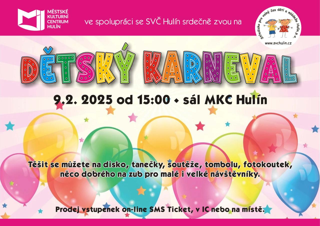 DĚTSKÝ KARNEVAL do Hulína, který se uskuteční 9. 2. 2025 od 15:00 v sále MKC Hulín.