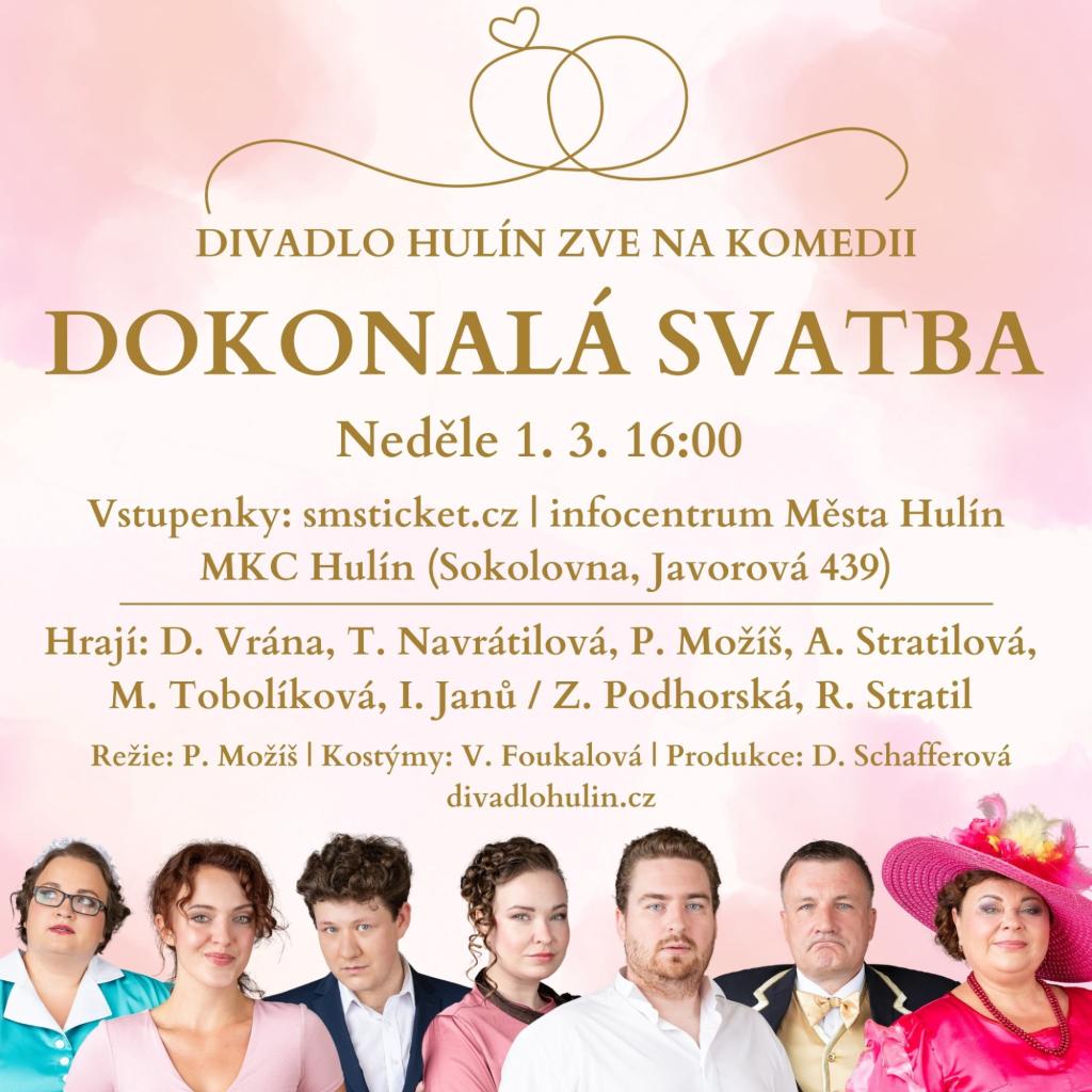 Srdečně Vás zveme na inscenaci Divadla Hulín DOKONALÁ SVATBA – situační komedii o tom, co všechno se může přihodit během osudné noci před svatbou. Připravte se na večer plný nečekaných zvratů, komických situací a nezapomenutelných postav.