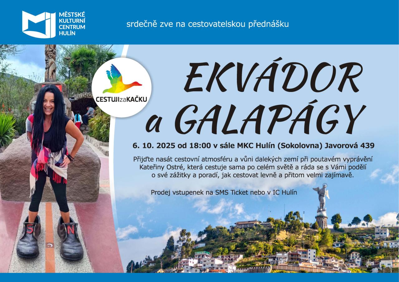 Městské kulturní centrum Hulín Vás srdečně zve na cestovatelskou přednášku EKVÁDOR a GALAPÁGY, která se uskuteční 6. 10. 2025 od 18:00 v sále MKC Hulín (Sokolovna Javorová 439).