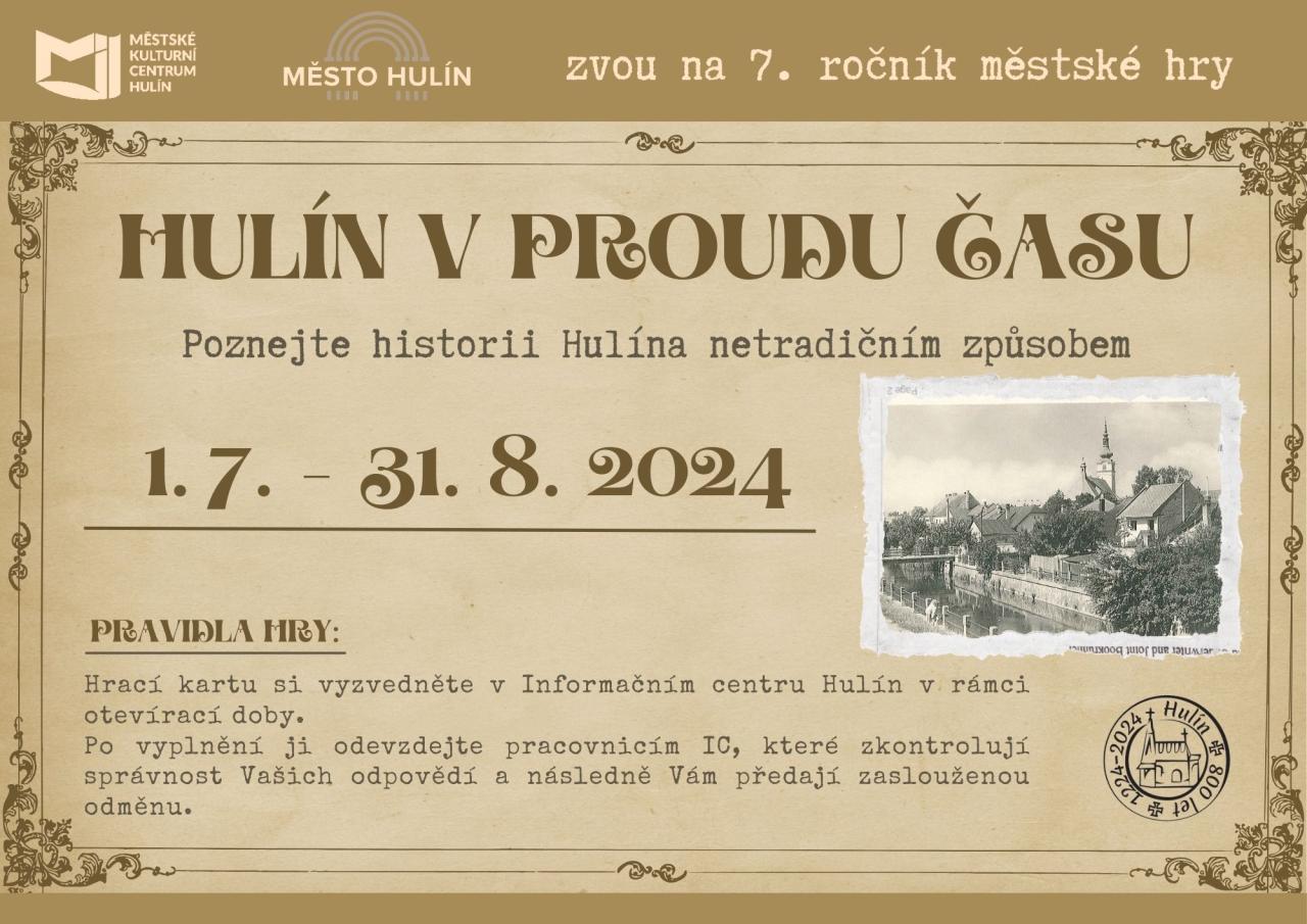 Srdečně Vás zveme na 7. ročník městské hry HULÍN V PROUDU ČASU, která bude probíhat v letních měsících 1. 7. - 31. 8. 2024. Poznejte historii Hulína netradičním způsobem.