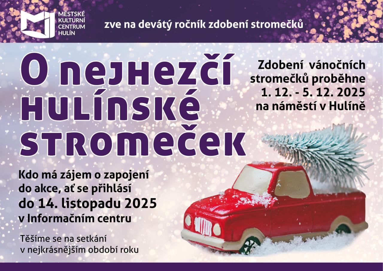 MKC Hulín zve všechny organizace na tradiční soutěž O NEJHEZČÍ HULÍNSKÉ STROMEČEK. Kdo má zájem, ať se přihlásí do 14. listopadu 2025 v Informačním centru Hulín, nebo přes e-mail infocentrumhulin@mkchulin.cz.