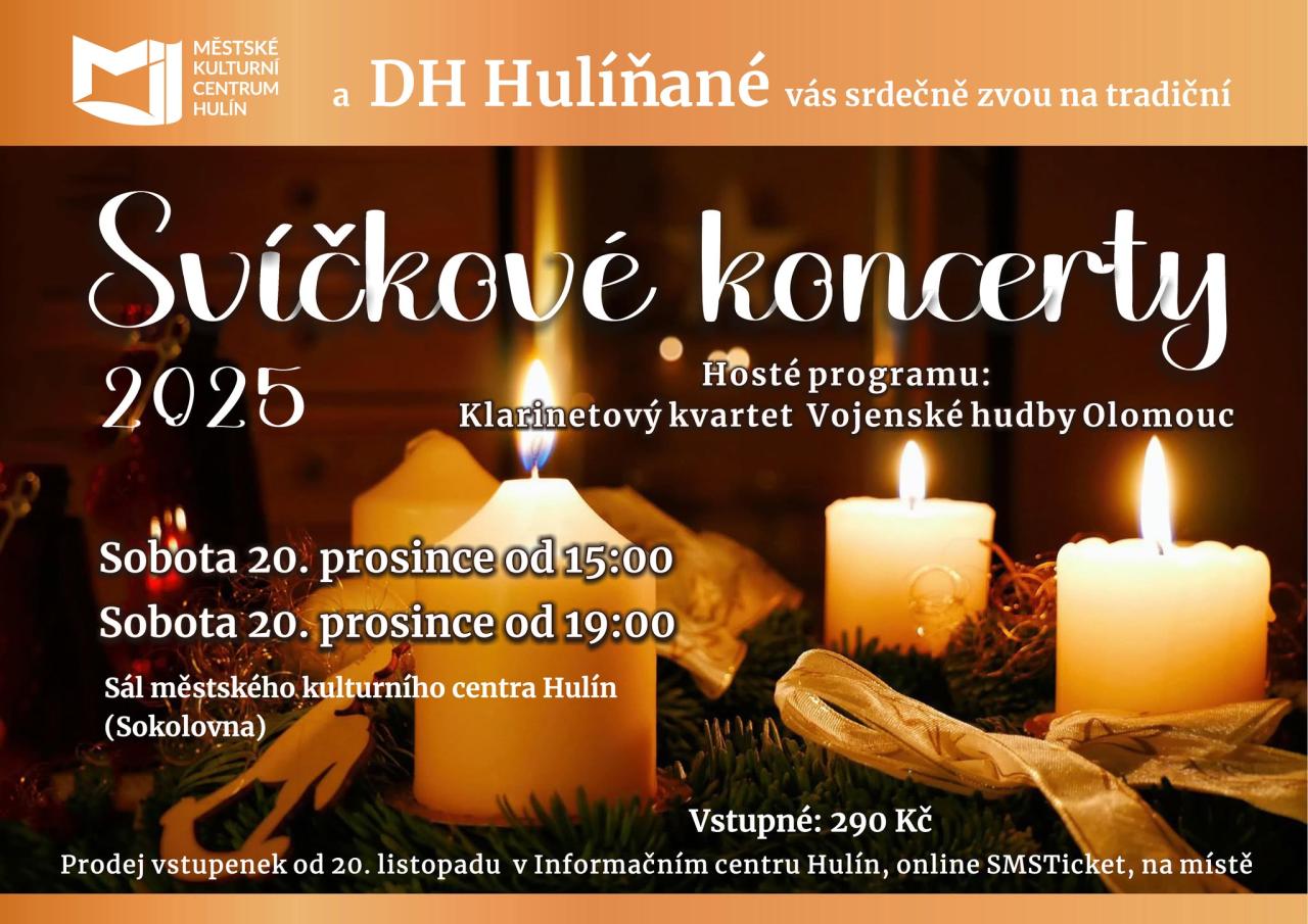 MKC Hulín s DH Hulíňané vás srdečně zvou na tradiční Svíčkové koncerty. Druhý koncert se uskuteční v sobotu 20. prosince 2025 v 19:00.