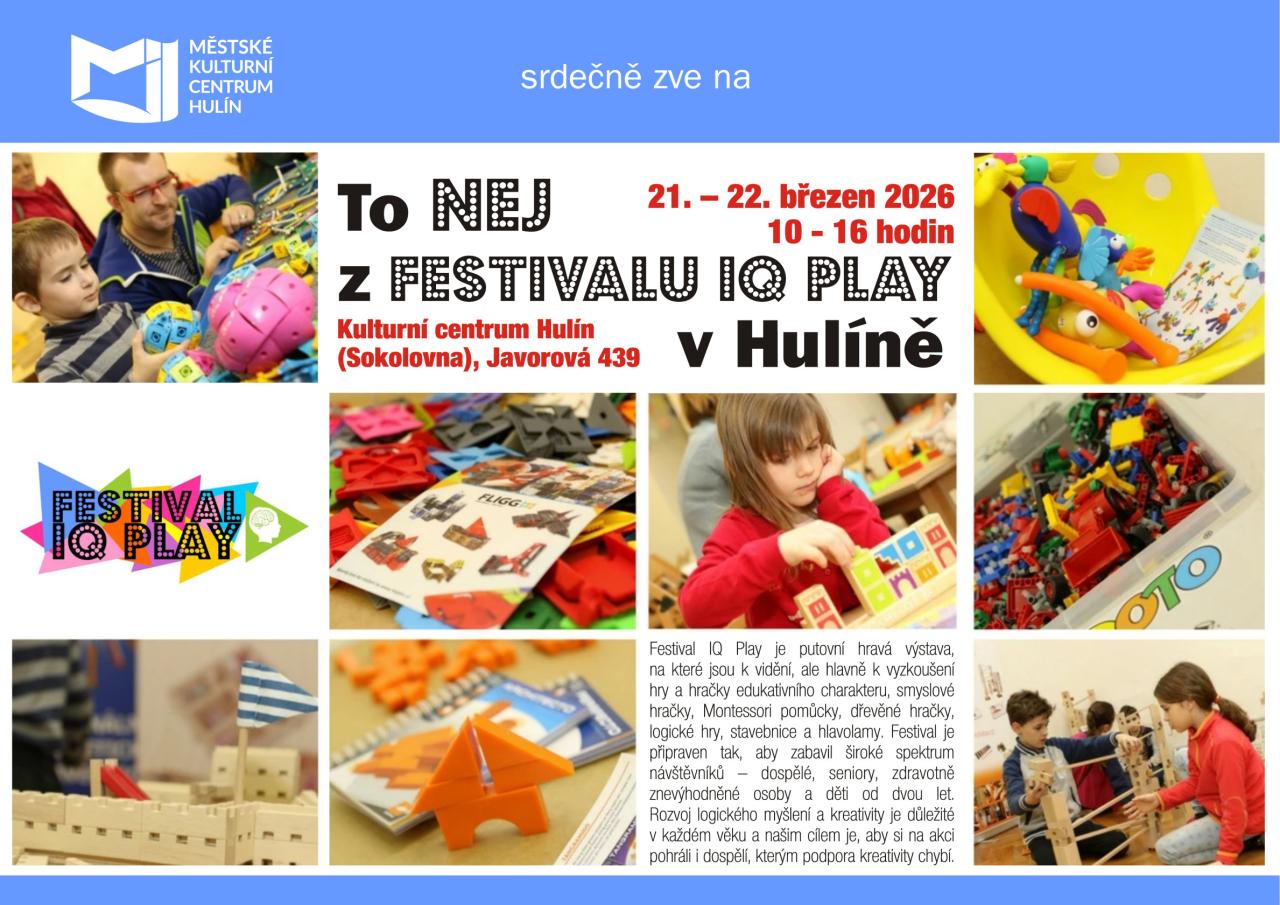 MKC Hulín srdečně zve na To NEJ z FESTIVALU IQ PLAY v Hulíně. Zábavná výstava proběhne 21. – 22. března 2026 od 10 do 16 hodin v sále MKC Hulín.